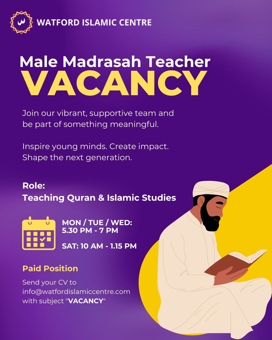 We are excited to announce a vacancy for a Male Madrasah Teacher to join our dedicated team at Watford Islamic Centre. This role offers a rewarding opportunity to teach Qur’an and Islamic Studies in a supportive and Islamic environment.